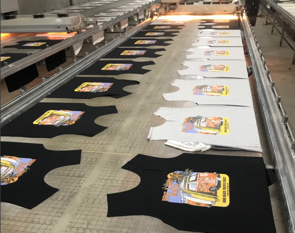 Sau khi vải đã được cắt xong, họ sẽ chuyển nó tới bộ phận chuyên in áo. Các phần khách hàng yêu cầu in sẽ được bộ phận thiết kế thực hiện từ vẽ hình, phối màu tới chọn vị trí in trên áo để xuất ra được phim in cho bộ phận phục trách in ấn.